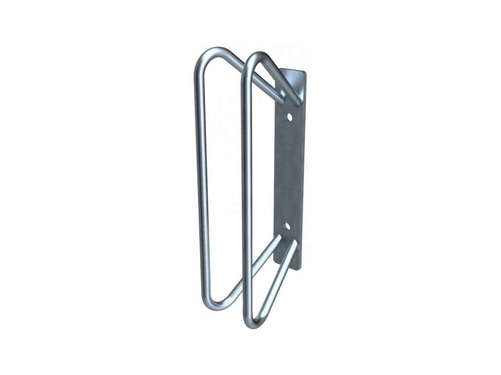 Stojan na jízdní kola určený k montáži na stěnu se skládá z obdélníkové základny o rozměrech 275 × 40 mm a svařovaných trubkových obručí o průměru 12 mm, které svírají se základnou úhel 90°.