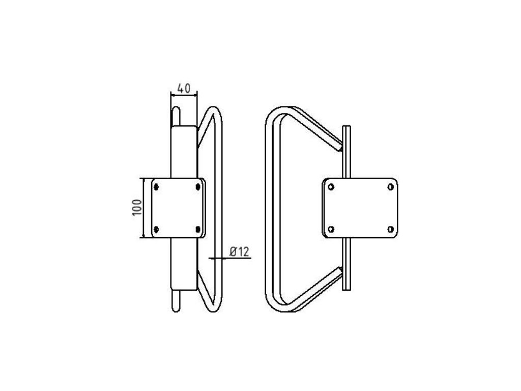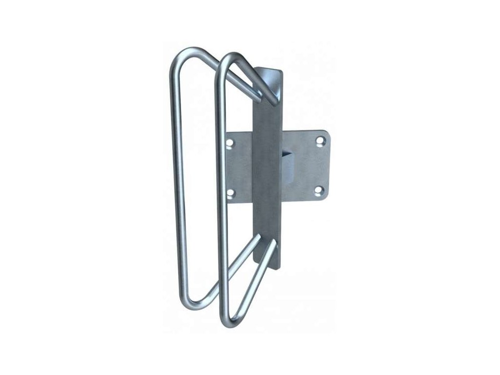 Stojan na jízdní kola určený k montáži na stěnu se skládá z obdélníkové základny o rozměrech 153x100 mm a svařovaných trubkových obručí o průměru 12 mm, které svírají se základnou úhel 45°.