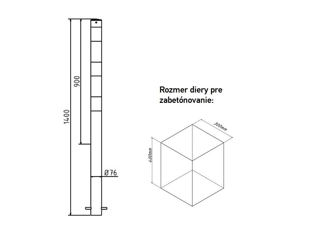 Pevný parkovací sloupek o celkové délce přibližně 1400 mm, z toho 900 mm odstup od povrchu země a 500 mm pro zabetonování.