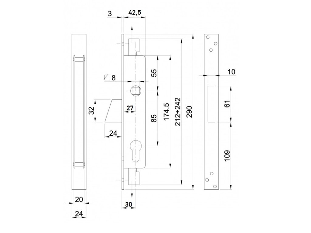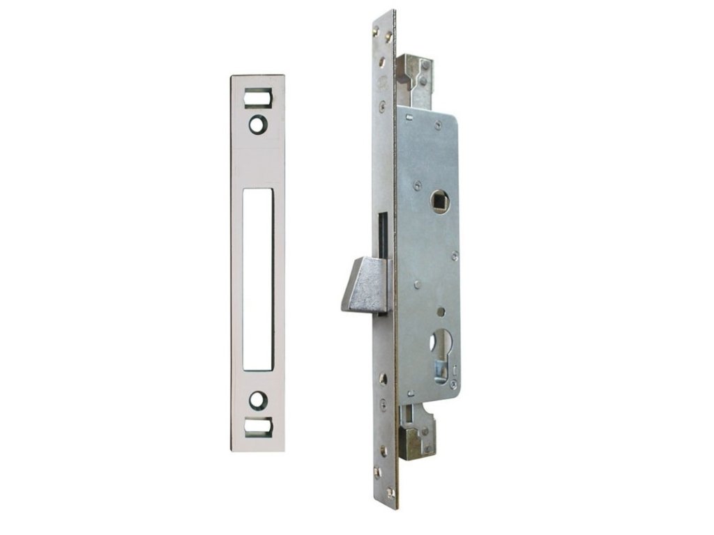 Bezpečnostní zámek, uzamykatelný ve 3 bodech, otevírání klikou. Zámek je vyroben z pozinkované oceli a ochrana proti zkroucení je z niklu.