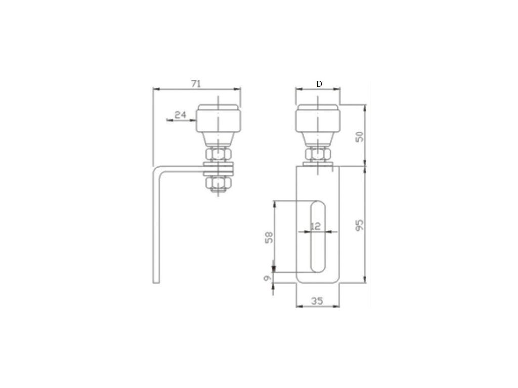 Boční vedení pro posuvné brány s válečky potaženými plastem nebo pryží. Držák má možnost regulace (viz výkres). Je určen k přišroubování ke stěně, plotu nebo nivelační sloupek.