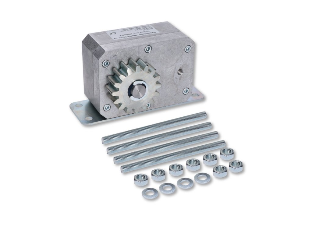 Hydraulická brzda pro posuvné brány na svazích. Součástí je ozubený postroj M4.