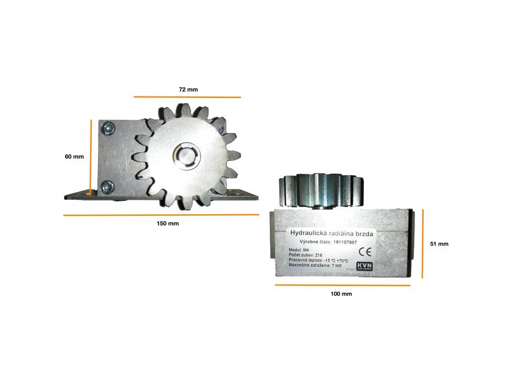 Hydraulická brzda pro posuvné brány určené pro svahy. Vhodné pro posuvné brány do kopce s pohonem. V takových případech může dojít ke zničení pohonu tahem/brzděním brány a je třeba použít hydraulickou/odporovou brzdu. Odporová brzda chrání převodovku a má možnost ovládat brzdnou sílu a měnit směr brzdění. Obsahuje ozubený pastorek M4 se 16 zuby.