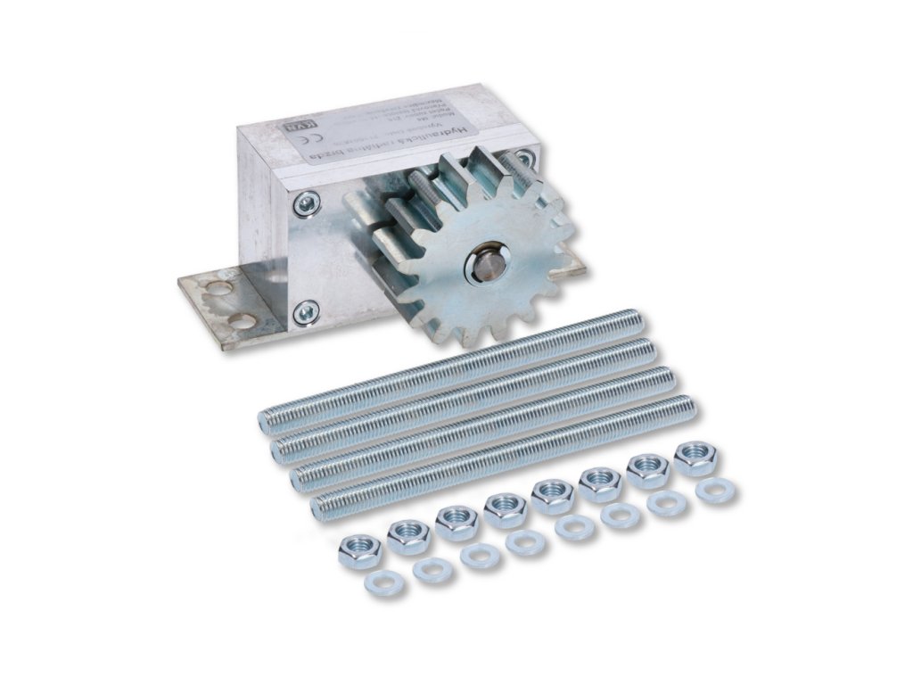 Hydraulická brzda pro posuvné brány na svazích. Součástí je ozubený postroj M4.