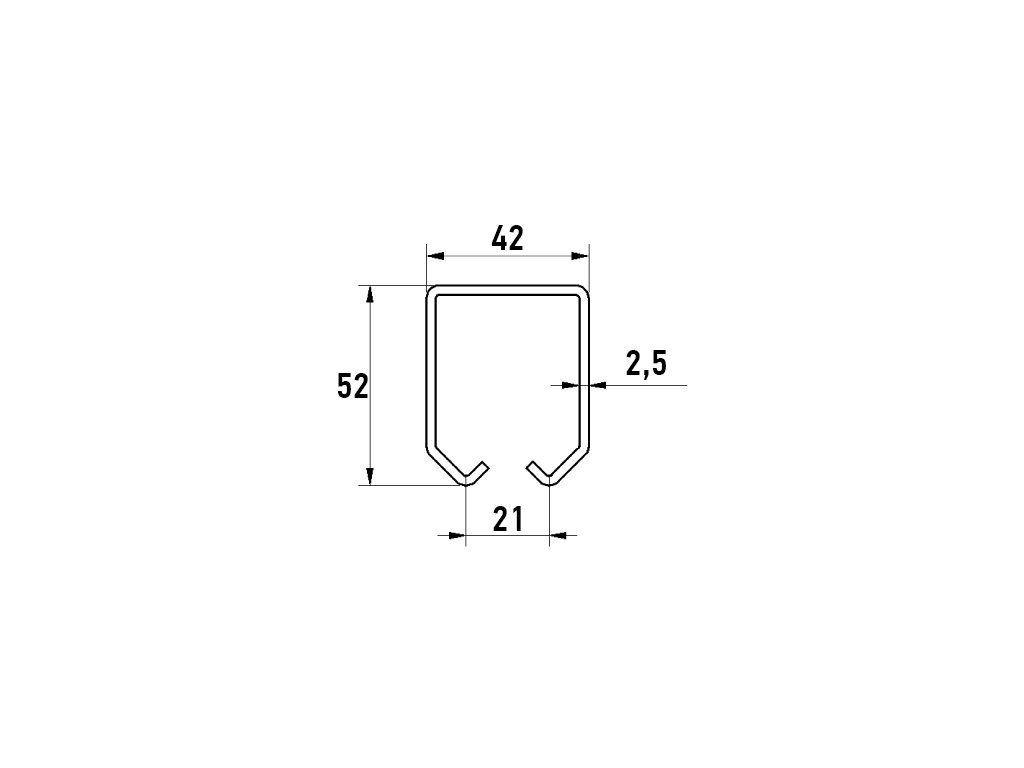 Vodicí C-profil pro zavěšení brány, dveří, zástěny nebo střešního okna, rozměr 42x52x2,5mm, vyrobeno z pozinkované oceli.