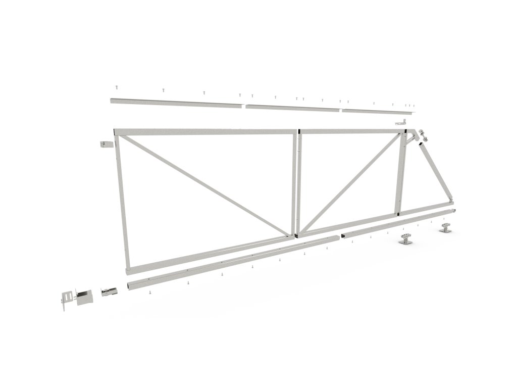 Brána se skládá ze tří dílů, které jsou prefabrikované,matice jsou již přinýtované v konstrukci rámu a lzeji snadno smontovat během 60 minut bez svařování. V šechny součásti jsou k sobě přišroubovány. Bránulze použít pro levé i pravé otevírání .