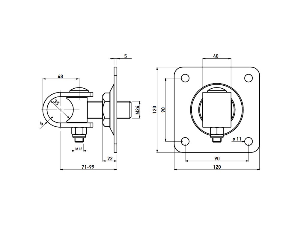 Závěs je ukotven závitem M24 s nastavitelnou vzdáleností brány od stěny v rozmezí 71-99 mm.