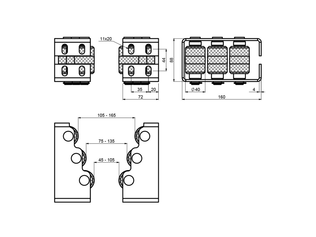 Nastavitelný horní doraz CAIS PADDOCK6 s minimální nastavitelnou šířkou 45 mm. Zarážka obsahuje 6 válečků pro snadnější zavádění profilu do zarážky. Pro jedno těsné uchycení je vhodné použít držák zastávky.
