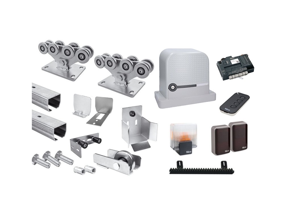 Sada komponentů KIT DEMO MZE 23 pro výrobu samonosných posuvných bran s šířkou průjezdu do 6,5 m/625 kg. Všechny součásti sady jsou pozinkované.