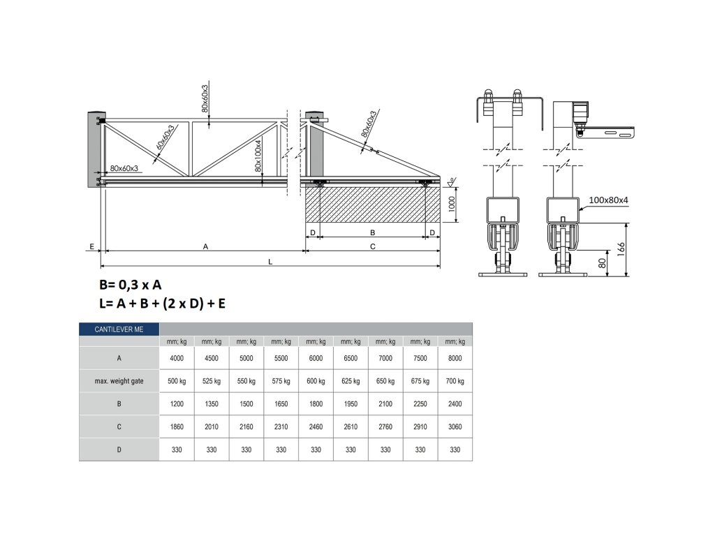 Sada je vhodná pro šířku průjezdu až 8 m a celkovou hmotnost brány 700 kg. Následující nákres ukazuje rozměry pro ilustrativní šířky křížení s návrhem vhodných konstrukčních profilů. V následující tabulce jsou uvedeny rozměry patek pro každou šířku průjezdu samonosné posuvné brány.