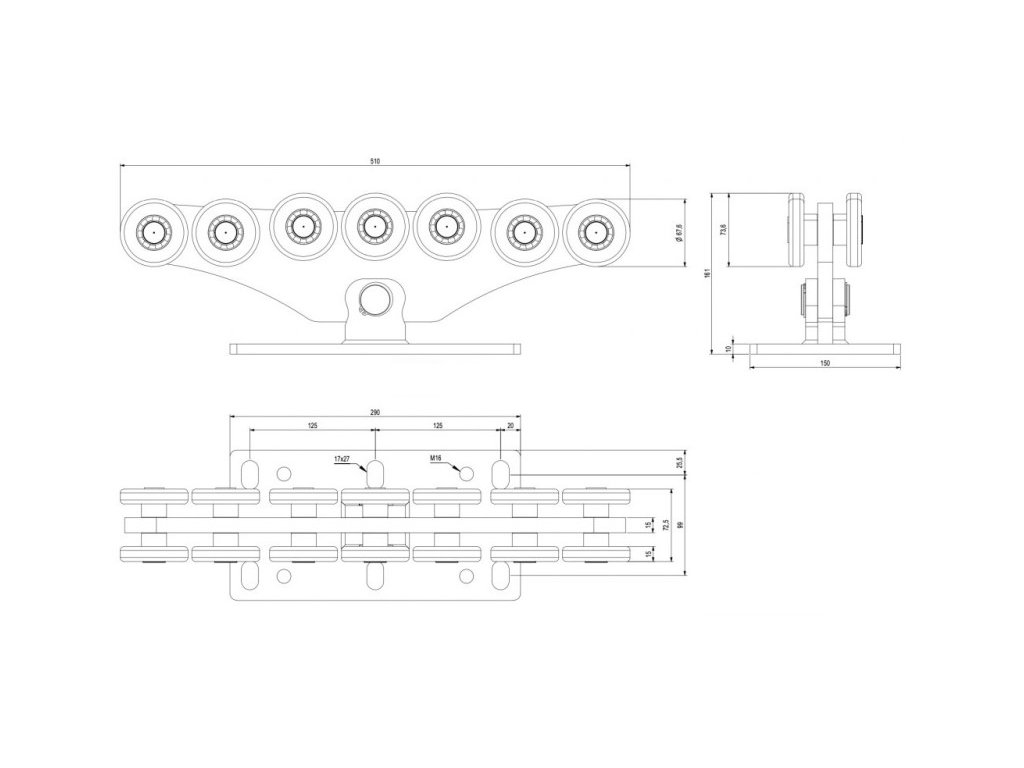 Vozík se 14 kovovými koly pro C-profil 95x86x5mm.