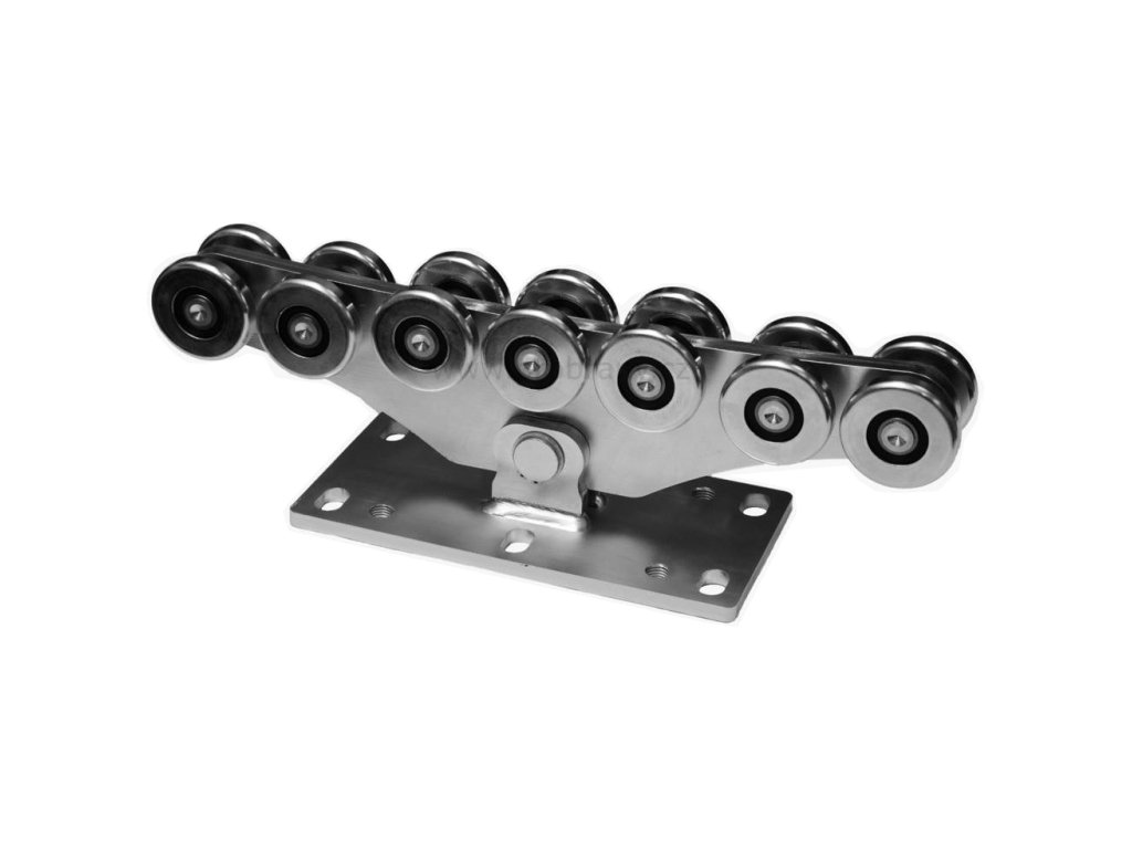 Výkyv vozíku slouží k rovnoměrnému rozložení hmotnosti/tlaku brány na všechny ložiskové válečky vozíku v každém okamžiku pohybu brány.