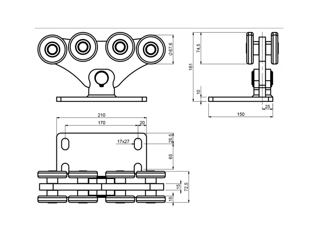 CAIS Vozík pro C-profil 95x86x5mm, 8 válečků, odsazený, pro posuvné brány na svahu SPEED MEK