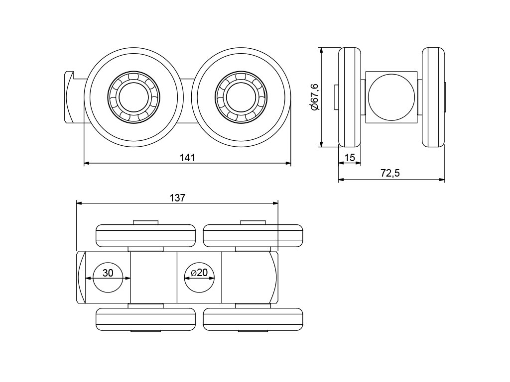 Uprostřed vozíku je otvor o průměru 20 mm, který lze použít k ukotvení vozíku k horní části závěsné brány různými způsoby.