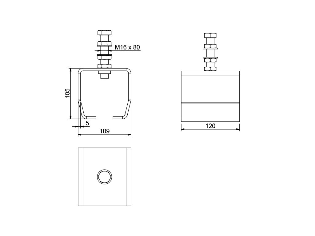 Závěsný držák CAIS DC90 vhodný pro vertikální montáž C-profilu 95x86x5mm, s nastavením výšky a ovládáním odskoku od stěny. Montáž se provádí pomocí závitové tyče M16, která je připevněna k boční konzole délky 140 cm nebo boční konzole délky 180 cm.