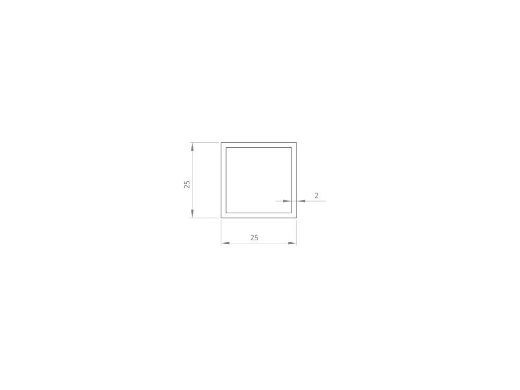 Čtvercový profil z přírodního hliníku bez povrchové úpravy o rozměrech 25x25mm a tloušťce 2mm.