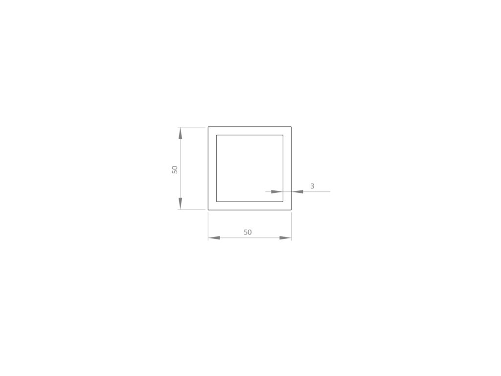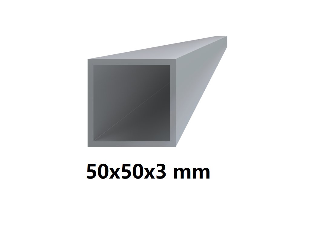 Čtvercový profil z přírodního hliníku bez povrchové úpravy o rozměrech 50x50 mm a tloušťce 3 mm.