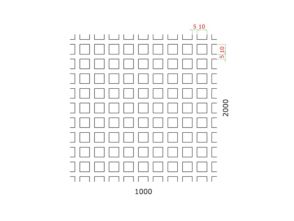 Rozměry plechu jsou 1000 mm x 2000 mm a jeho tloušťka je 1,5 mm. Otvory v plechu o rozměrech 10 mm x 10 mm s roztečí 15 mm.