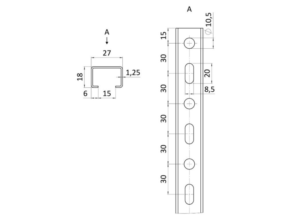 Perforovaný konstrukční C-profil o rozměrech 27x18mm s tloušťkou stěny 1,25mm a celkovou délkou 3m.
