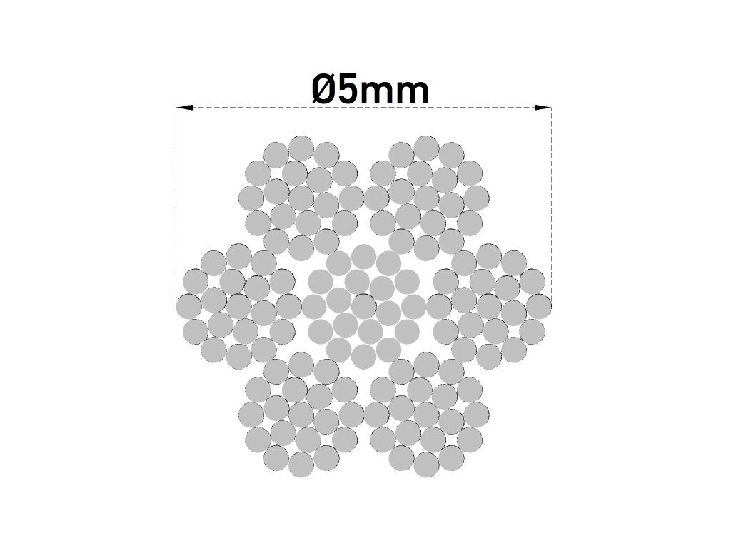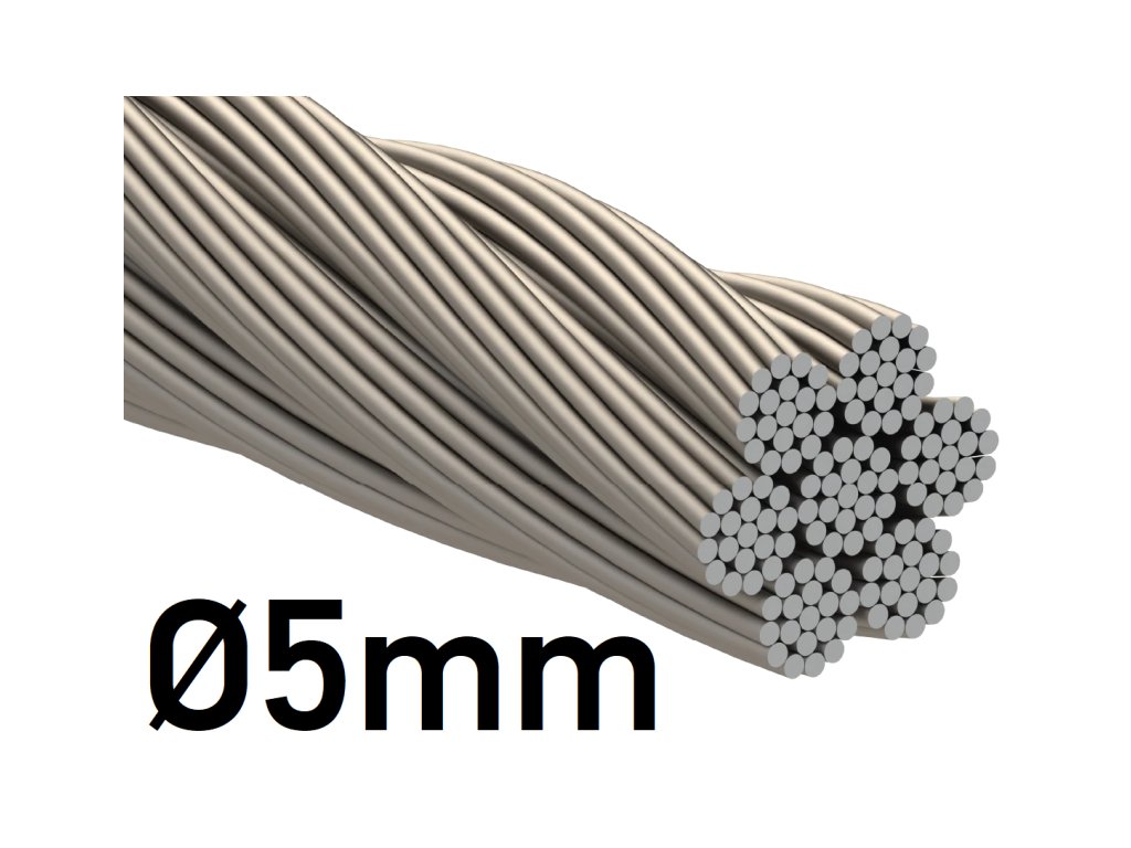 Nerezové ocelové lano o průměru 5 mm složené ze sedmi svazků devatenácti drátů vyrobených z vysoce kvalitní antikorozní oceli AISI316.