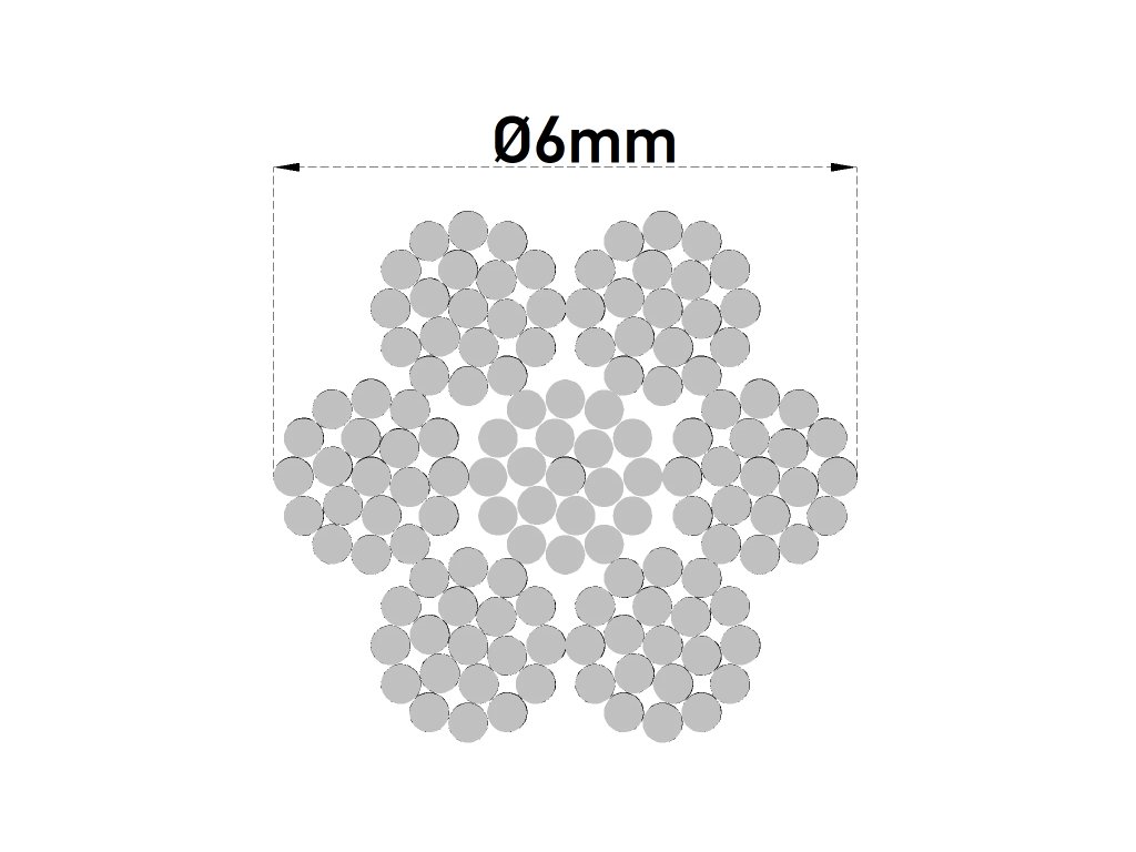 Nerezové ocelové lano o průměru 6 mm složené ze sedmi svazků devatenácti drátů vyrobených z vysoce kvalitní antikorozní oceli AISI316.
