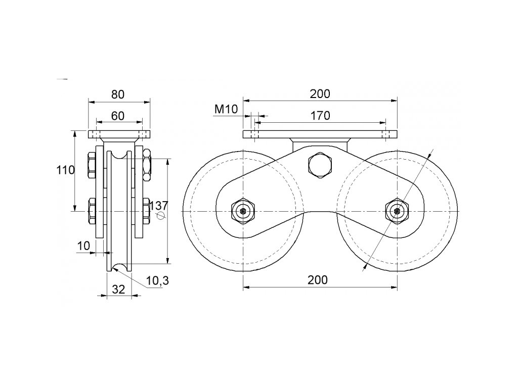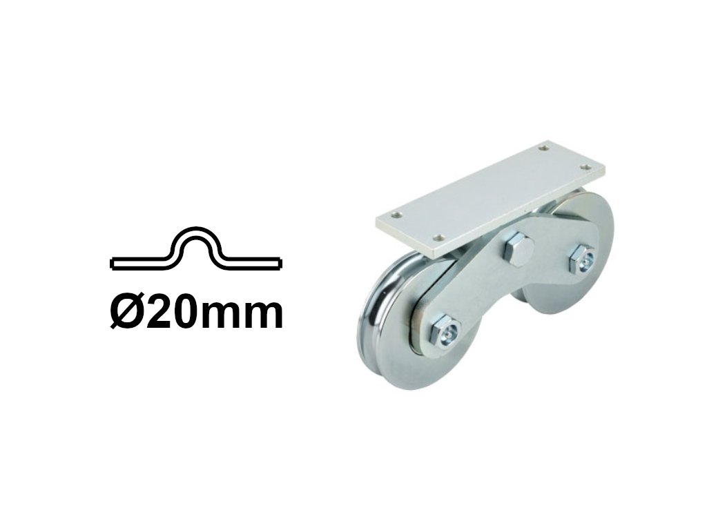 Pozinkované dvojité kolo se šroubovým držákem, pro kolejnici ve tvaru U, s vysoce kvalitními ložisky italské výroby. Nosnost až 1 800 kg.