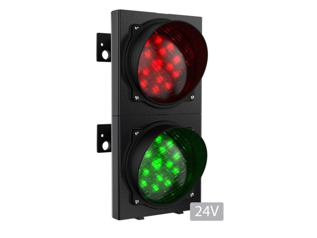 Dvoukomorový semafor, zelená/červená. Výrobek obsahuje LED světlo na 24 V napájení. Získal certifikaci podle normy IP65. Je tak odolný vůči nárazům, prachu a tryskající vodě.