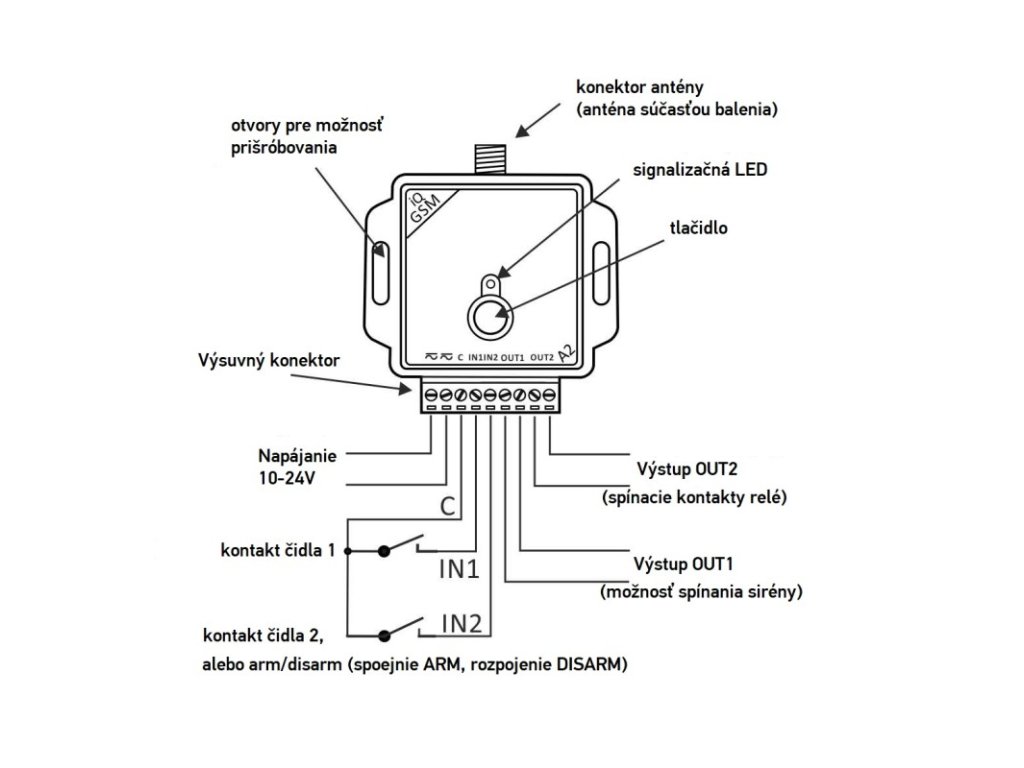 Galvanicky oddělený široký napěťový vstup umožňuje připojit tlačítka, senzory a výstupy senzorů. Můžete snadno vyhodnotit stav těchto zařízení a při změně stavu (odpojení/připojení) vám modul GSM zašle zprávu SMS, zavolá vám nebo obojí (nastavitelný text zprávy SMS).