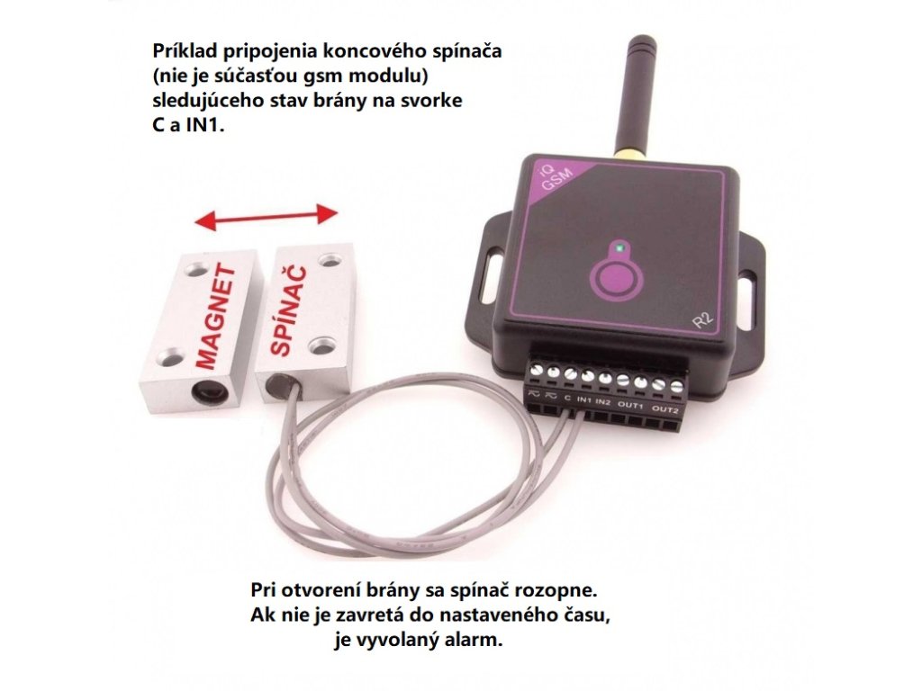K bráně připojíte magnetický kontakt, který je v zavřeném stavu brány sepnutý, a připojíte jej ke vstupu IN1. Poté se nastaví čas, za který se má brána zavřít (magnetický kontakt se má spojit), a pokud se do zvoleného času nespojí, zazvoní modul GSM. Vstup IN2 slouží spíše jako zabezpečení proti neoprávněnému otevření brány. Pokud znovu vytočíte modul GSM, bude IN2 deaktivován. I když je magnetický kontakt odpojen, modul GSM vás o tom neinformuje. Pokud však dojde k odpojení kontaktu bez vyzvánění, modul GSM vás upozorní na odpojení.