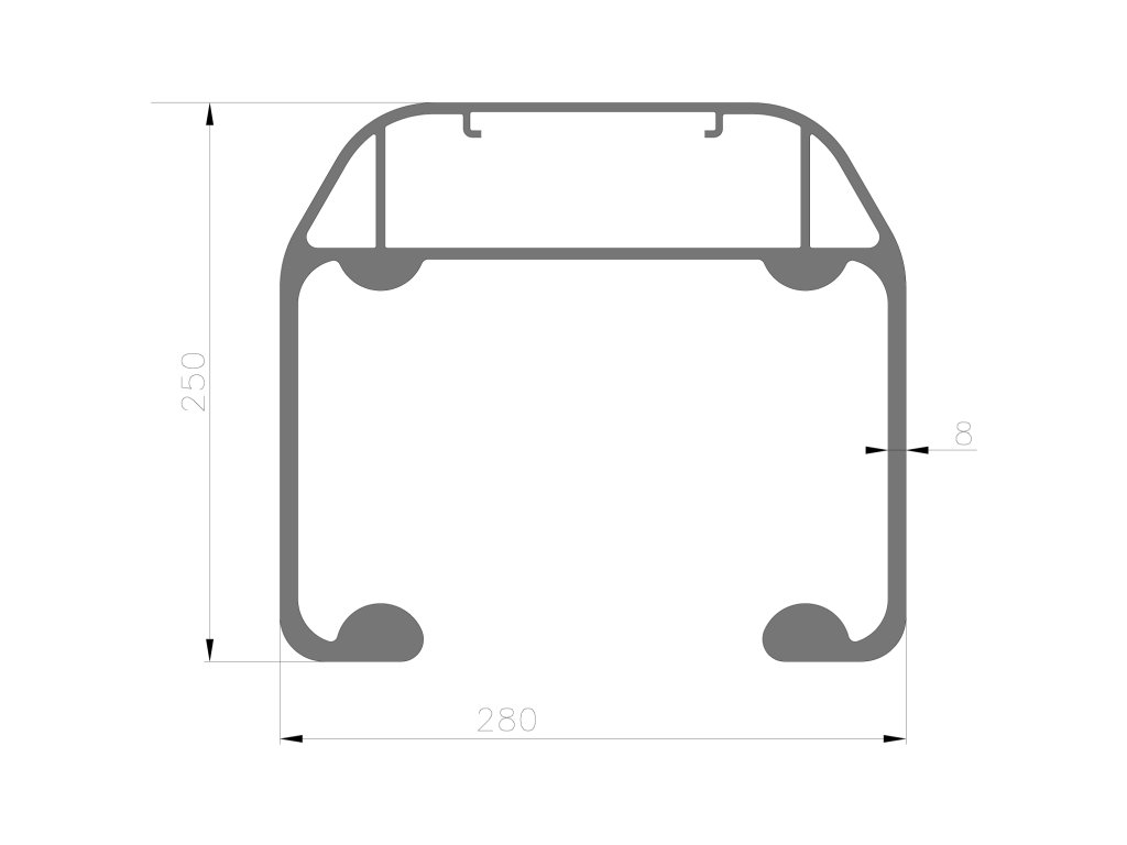 Frézovaná hliníková koncovka pro profil 280x250 mm, s gumovou zarážkou pro hladší doraz do zarážky dveří.