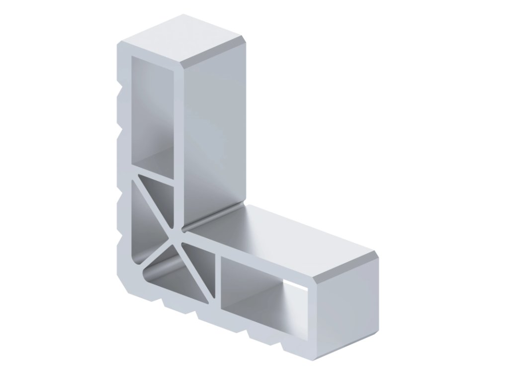 Výstupky a drážky na spojce zajišťují její přesné a pevné uložení v rohovém spoji. Vyrobena je z odolného hliníku, což zaručuje dlouhou životnost a odolnost vůči korozi.