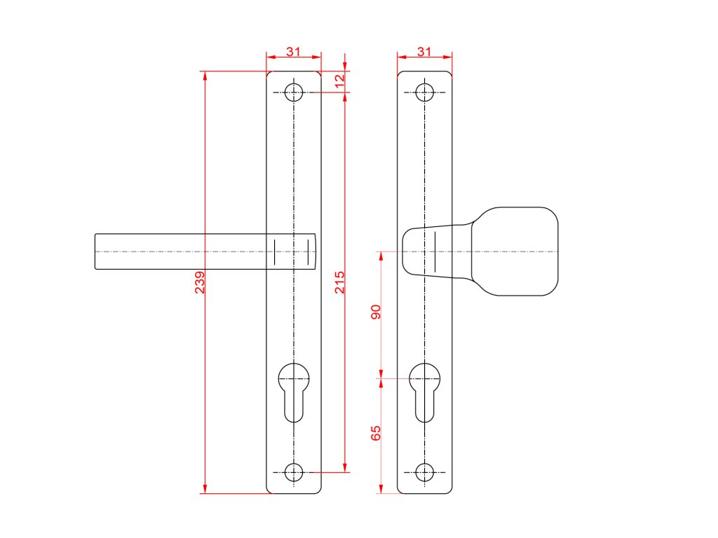 Hliníková rukojeť, rozměr štítu 239x31 mm, rozteč 90 mm, černá barva, s otvorem pro stavební vložku.