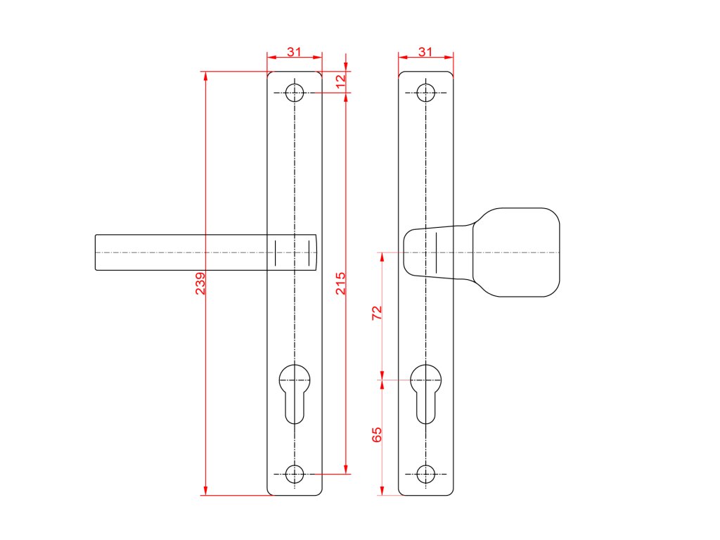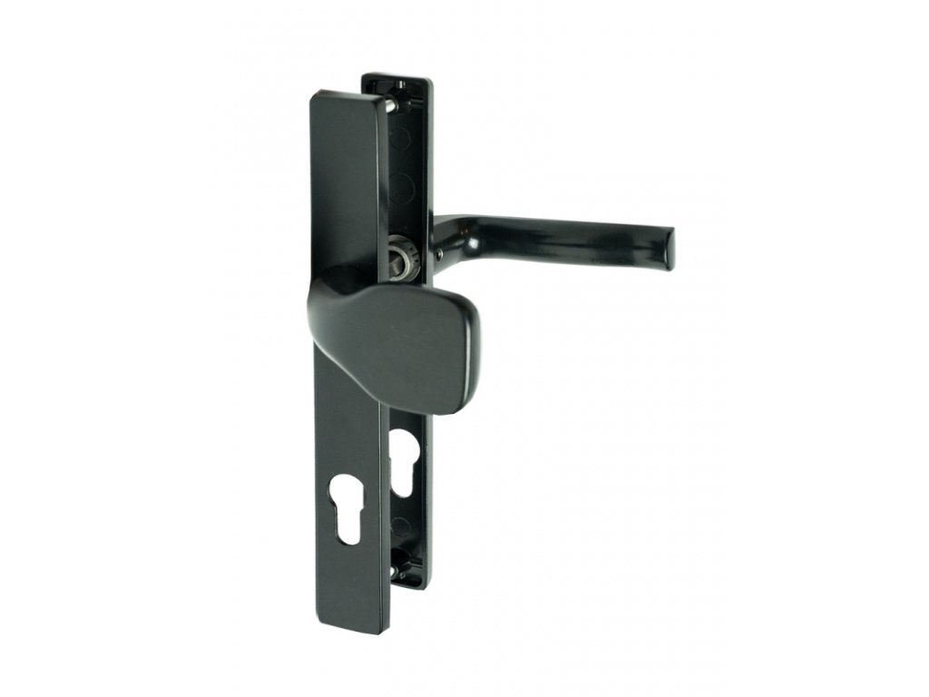 Hliníková rukojeť, rozměr štítu 239x31 mm, rozteč 72 mm, černá barva, s otvorem pro stavební vložku.