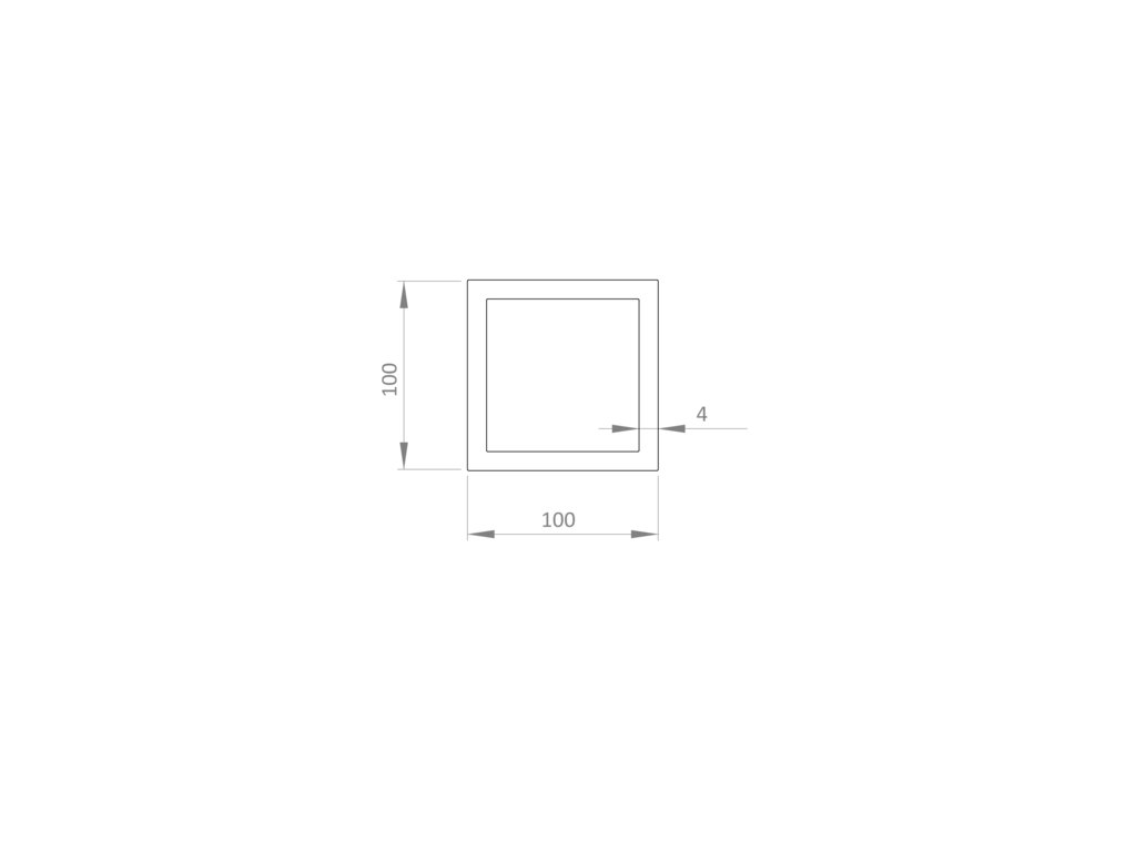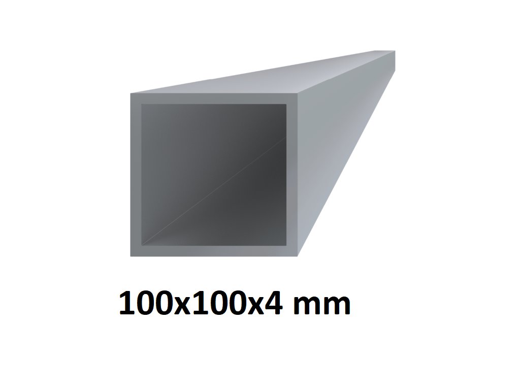 Čtvercový profil z přírodního hliníku bez povrchové úpravy o rozměrech 100x100 mm a tloušťce 4 mm.