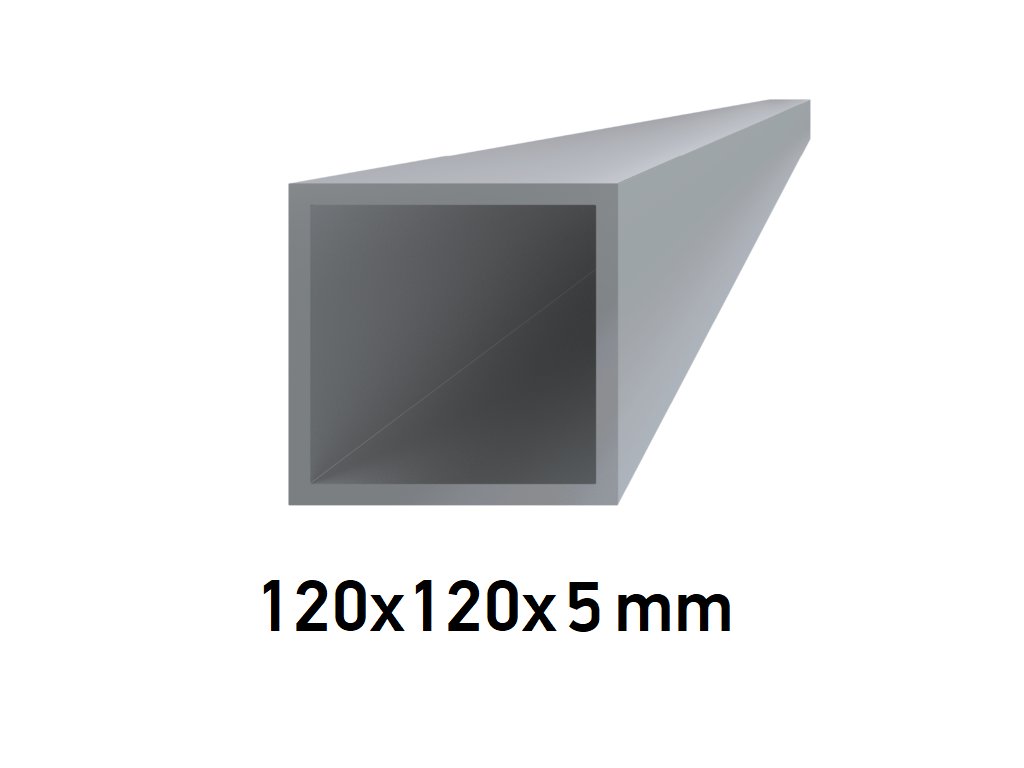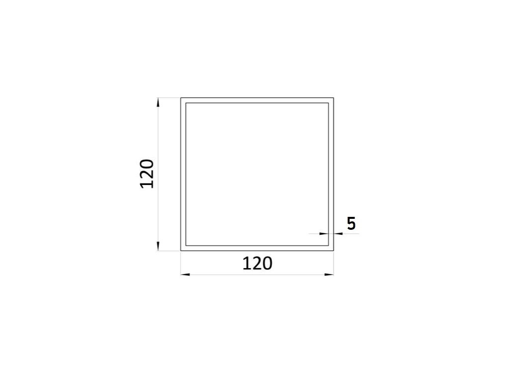 Čtvercový profil z přírodního hliníku bez povrchové úpravy o rozměrech 120x120 mm a tloušťce 5 mm.