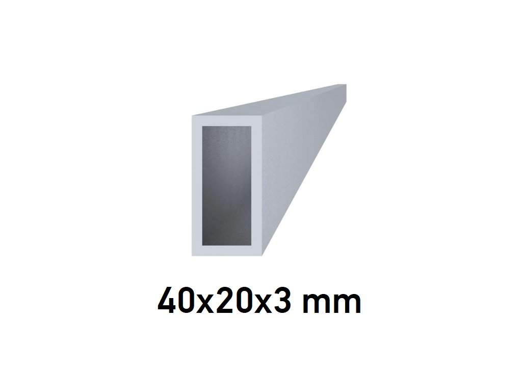 Obdélníkový profil z přírodního hliníku bez povrchové úpravy o rozměrech 40x20 mm a tloušťce 3 mm.