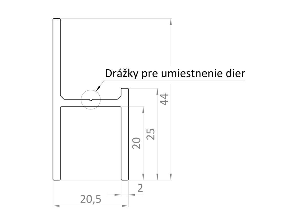 Hliníkový uchycovací profil pro plotové lamely má tvar UT, čili je vhodný pro montáž před sloupky na bráně, plotě nebo jiném otvoru. Vnější šířka profilu je 20,5 mm, přesah je 44 mm a délka 2 m, 3 m nebo 6 m.