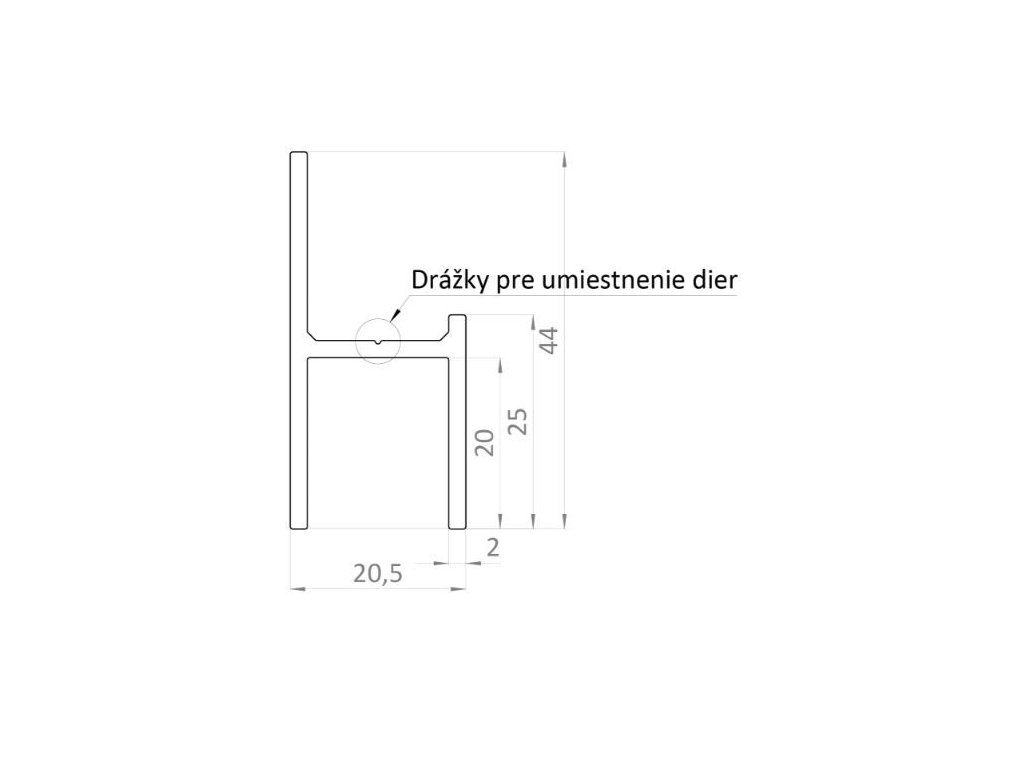 Hliníkový upevňovací profil pro plotové latě tvar UT, takže je vhodný pro montáž před sloupky na bránu, plot nebo jiný otvor. Vnější šířka profilu je 20,5 mm, přesah je 44 mm a délka je 2 m, 3 m nebo 6m.