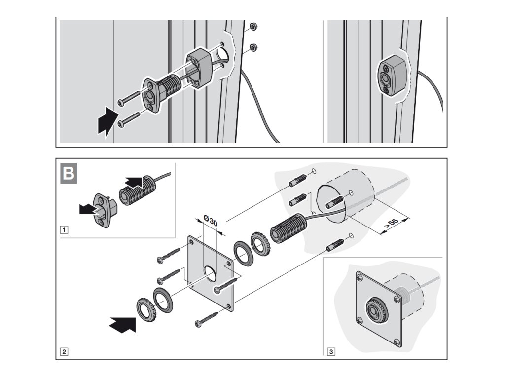 Montážní tvar fotobuněk je určen především pro montáž na kovovou konzolu brány, ale lze je namontovat do jakéhokoli profilu nebo desky s průměrem otvoru 30 mm, pro lepší představu viz instalační příručka.
