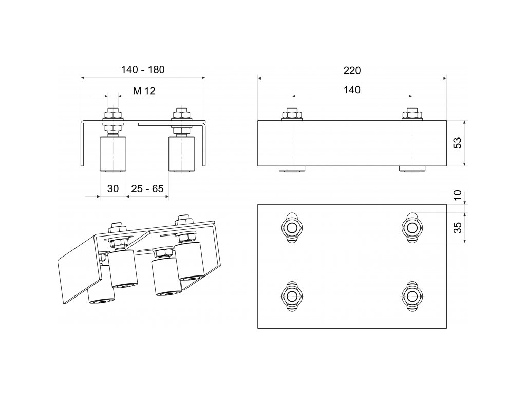 Horní vedení pro posuvné brány se čtyřmi nastavitelnými válečky. Průměr použitých válců je 30 mm, výška 40 mm a tyto roky jsou nylonové(C450-30x40). Tento čtyřválcový držák je určen k přivaření nebo přišroubování ke sloupku nebo ke stávajícímu oplocení na vašem pozemku.