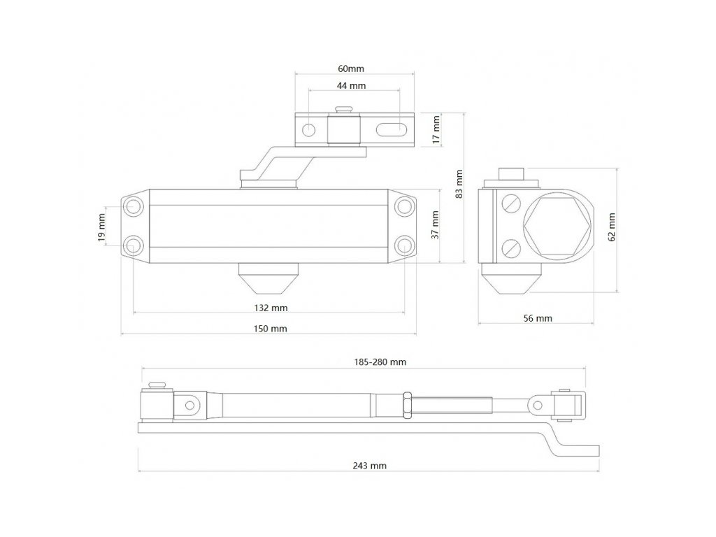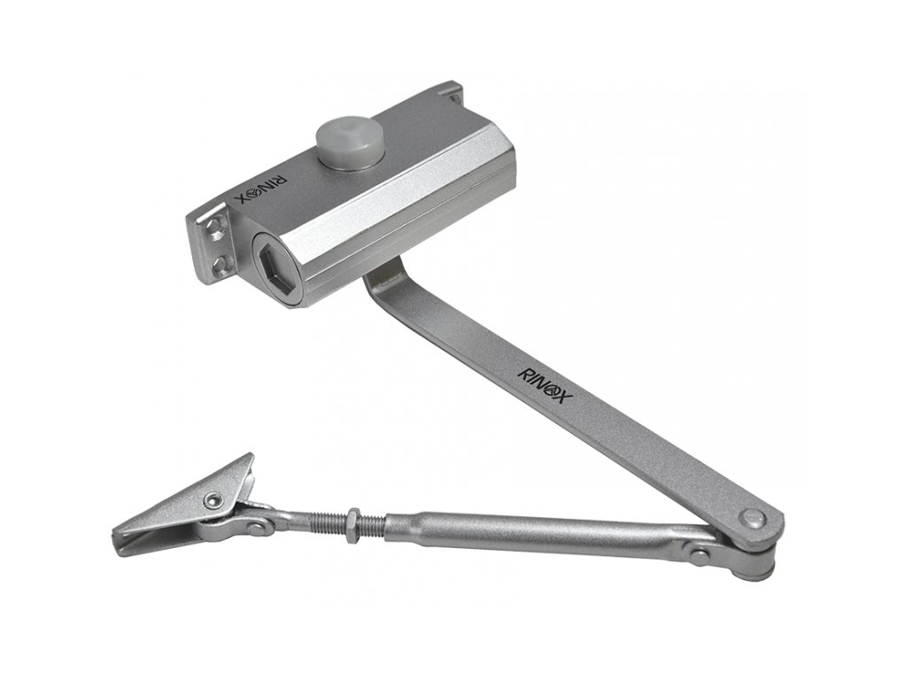 Hydraulický zavírač dveří pro vnitřní a venkovní dveře s maximální délkou 850 mm a maximální hmotností 45 kg. Rozměry zavírače jsou 148x36x56 mm a povrchová úprava je hliníková s šedým lakem.