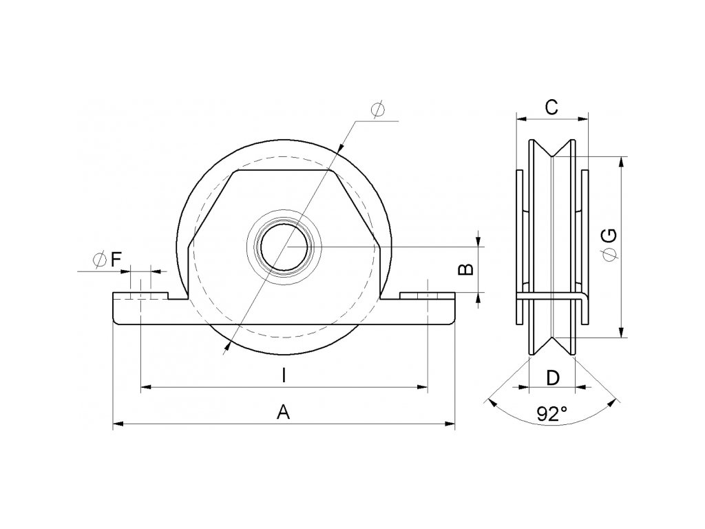 Kola s V-řezem lze použít na V-kolejnicích nebo na všech L-profilech/jezdech s pravým úhlem(90°). Nerezová ocel AISI304.