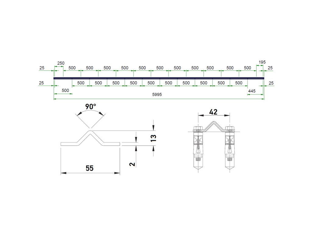 Kolejnice z nerezové oceli od italského výrobce Comunello, pro posuvná vrata, ve tvaru V (výřez 90°), s otvory pro šrouby, které jsou umístěny střídavě na obou stranách, na podkladu.