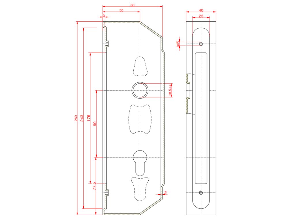 Kazeta se zámkem, rozměr 260x80x40 mm, rozteč 90 mm, pro joklové profily od 40x30.