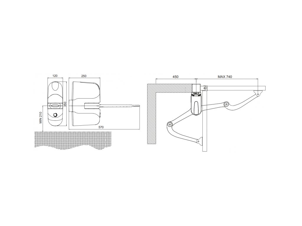 24 V, intenzivní provoz, do 2,3 m/250 kg, rychlost 90°: 14 - 20 s, RJ CT-14A, integrované světlo, koncové zarážky
