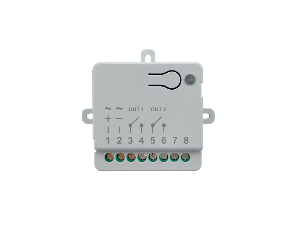 2 reléové výstupy 5 A (OUT1 monostabilní, OUT2 nastavitelný monostabilní/bistabilní) |