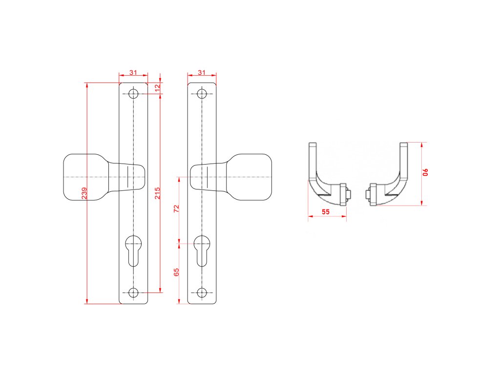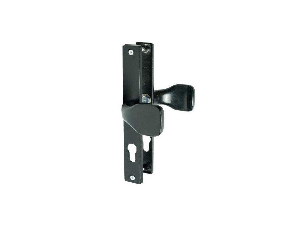 Hliníková rukojeť, rozměr štítu 239x31 mm, rozteč 72 mm, černá barva, s otvorem pro stavební vložku.