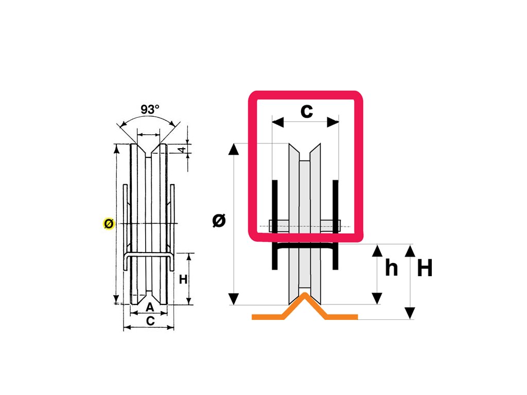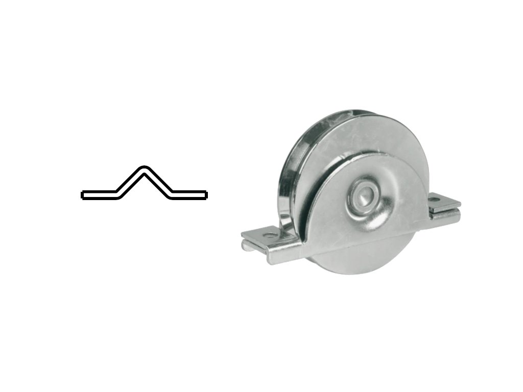 Pozinkované kolo pro kolejnici ve tvaru V s vysoce kvalitními ložisky vyrobenými v Itálii společností IBFM. Zapuštěná šroubovaná kolečka se používají kvůli estetice a menšímu odskakování dveří od kolejnice. Kola s V-řezem lze použít pro kolejnice ve tvaru V nebo na všechny profily L / třmeny s pravým úhlem (90°).