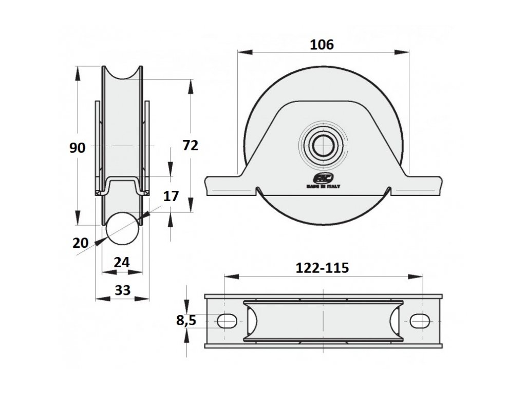 Vodicí kolečko pro teleskopickou kolejovou bránu do šířky průjezdu 4 m a do šířky průjezdu 8 m.