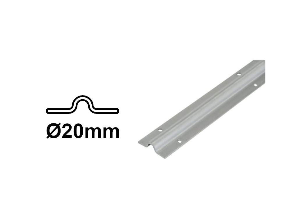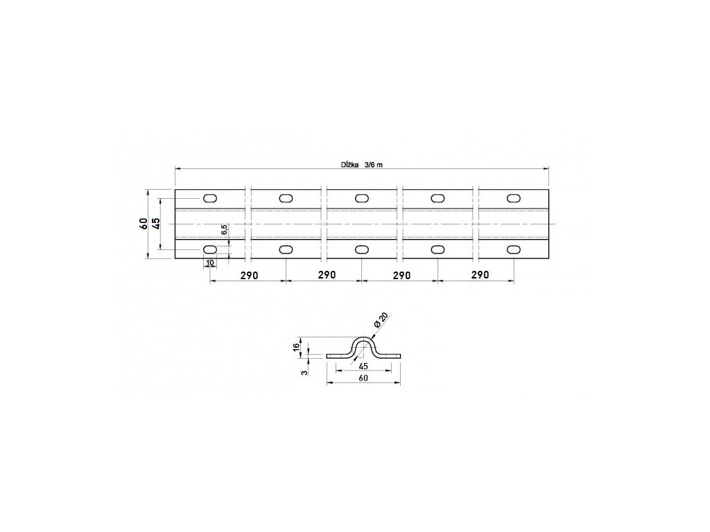 Kolejnice pro posuvnou bránu, tvar U, průměr 20 mm, s upevňovacími otvory, žárově pozinkovaná. Vhodné pro kola ve tvaru U.
